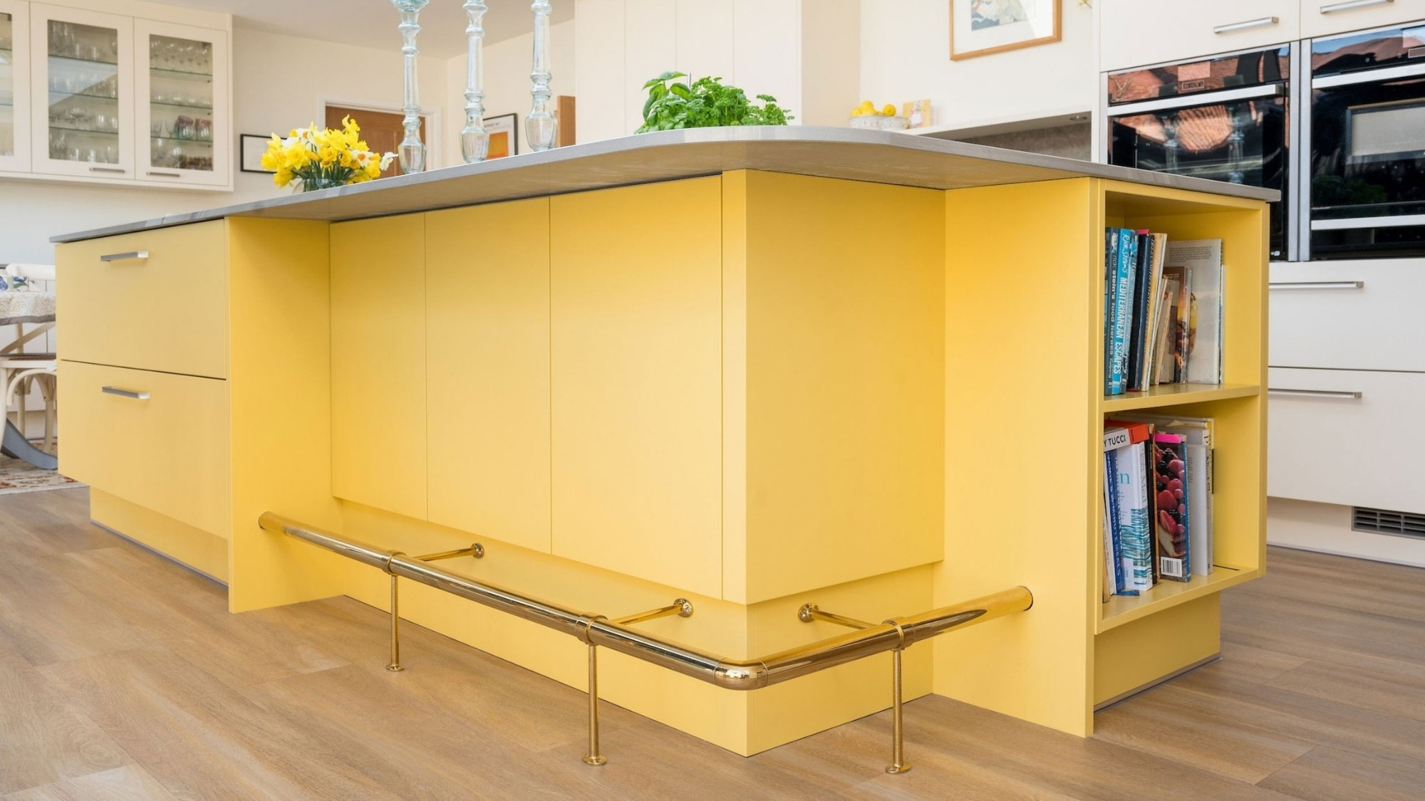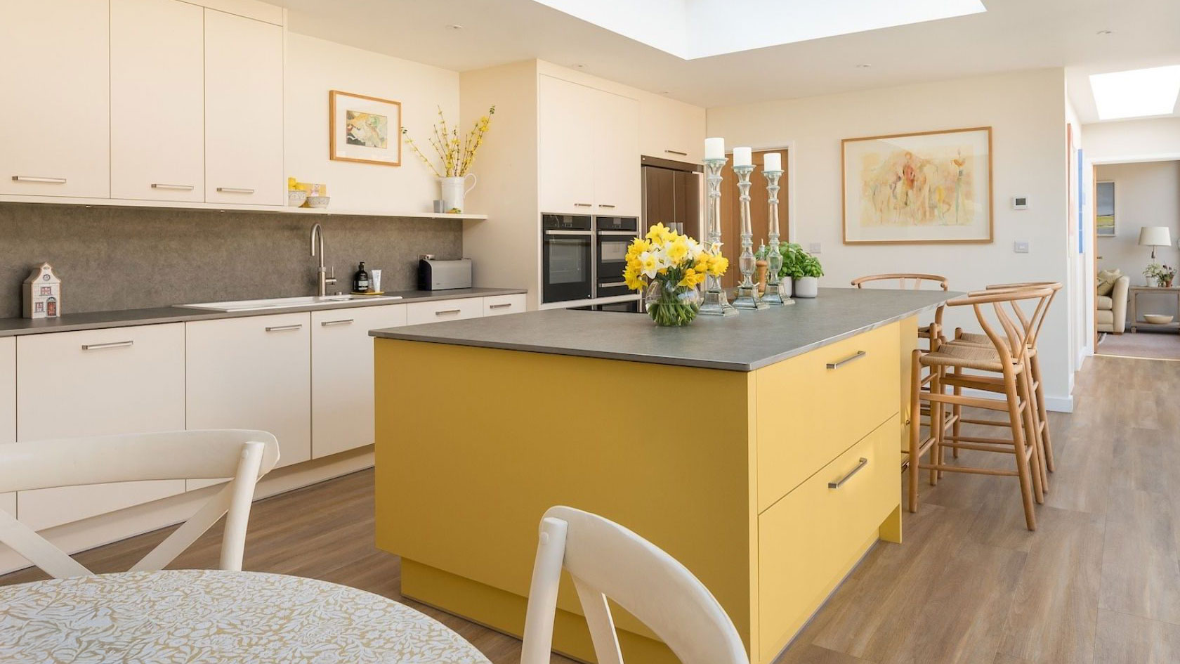 The graceful porcelain painted cabinets, soft sunburst yellow hue, and natural wood surfaces bring a classic country feel to the modern design. The finished result is a clean and fresh yet homely space, perfect for family living and special occasions.