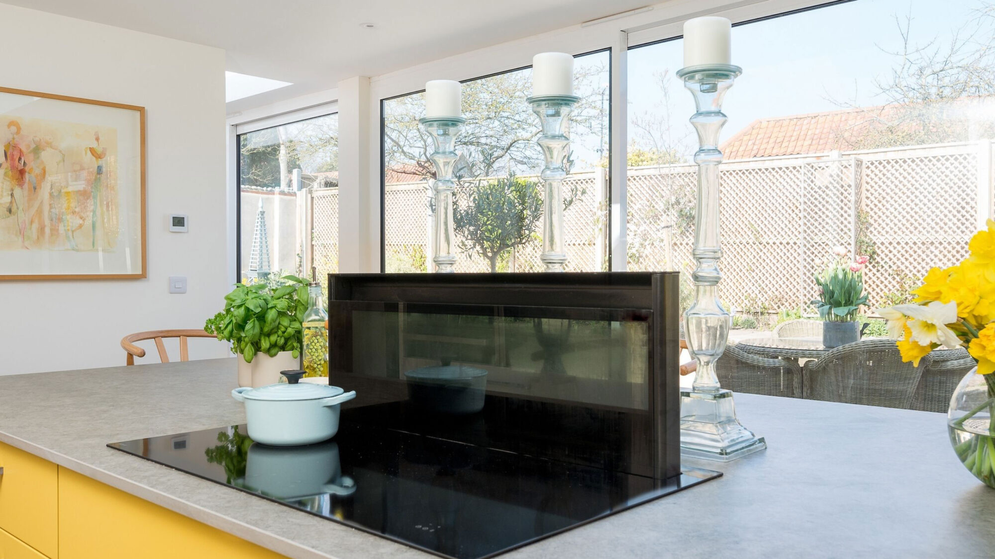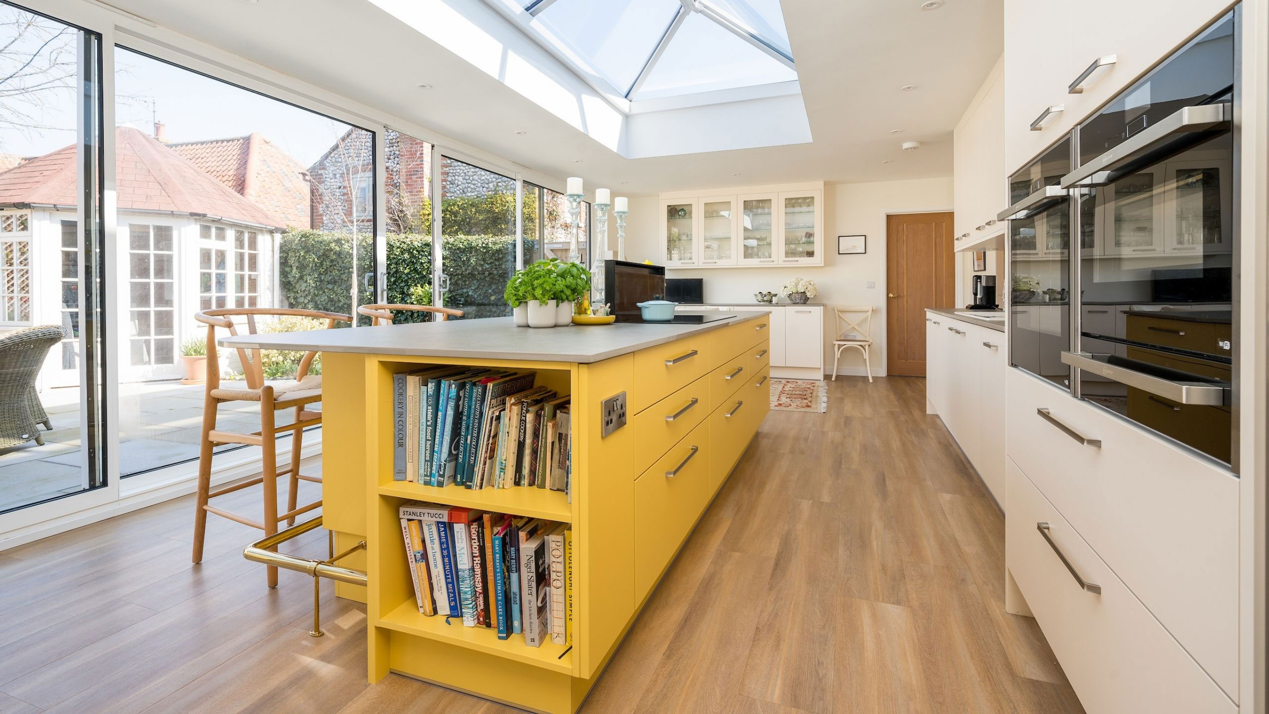 A large roof lantern and full length of sliding patio doors flood the room with natural light, accentuating the radiant colour scheme and minimal modern cabinetry.