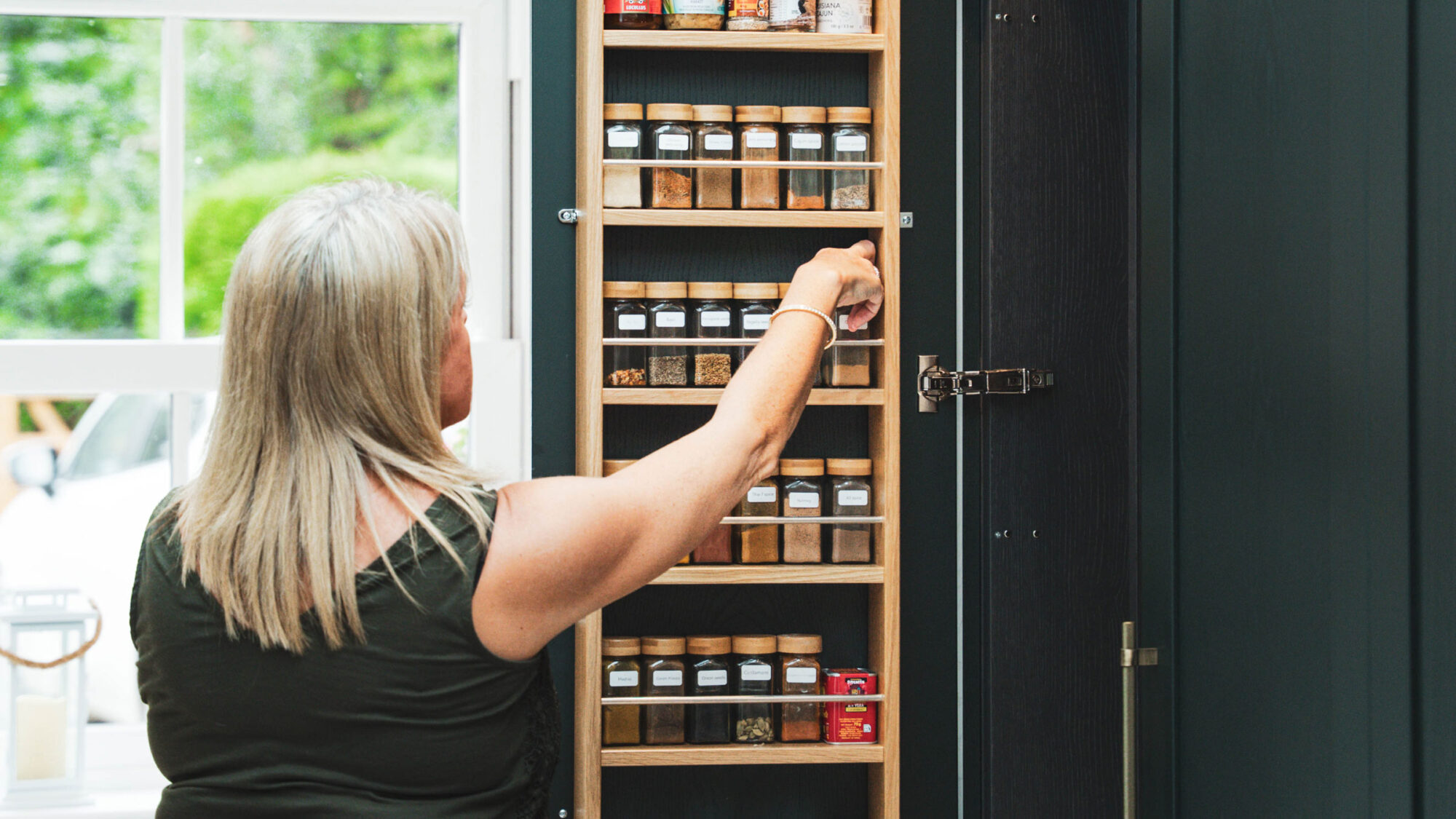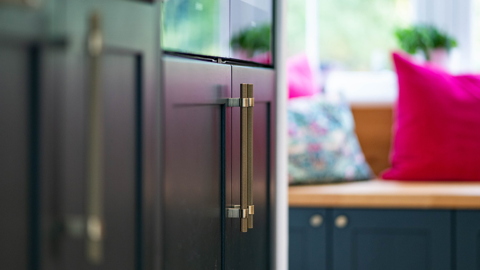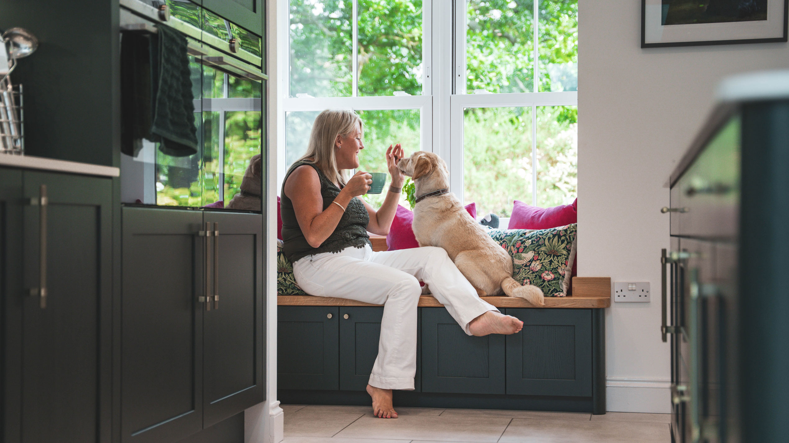 We’ve designed every drawer and cupboard to keep the space practical and clutter free, from bespoke spice racks to the hidden recycling bins. Nestled beneath a large window, a built-in window seat offers a peaceful nook for reading, relaxing, or simply gazing out at the garden.