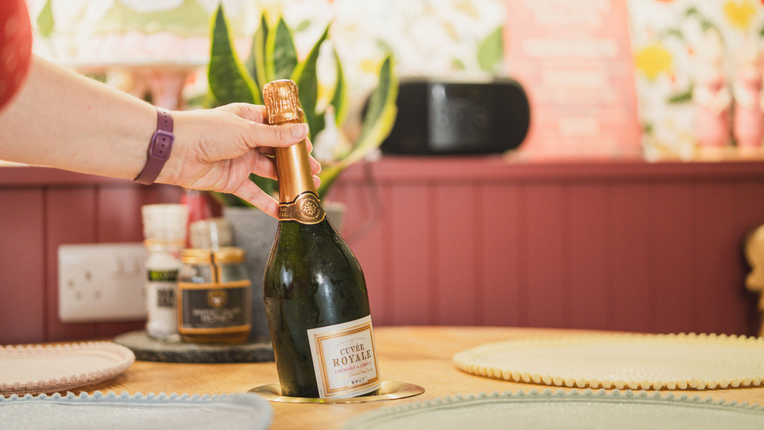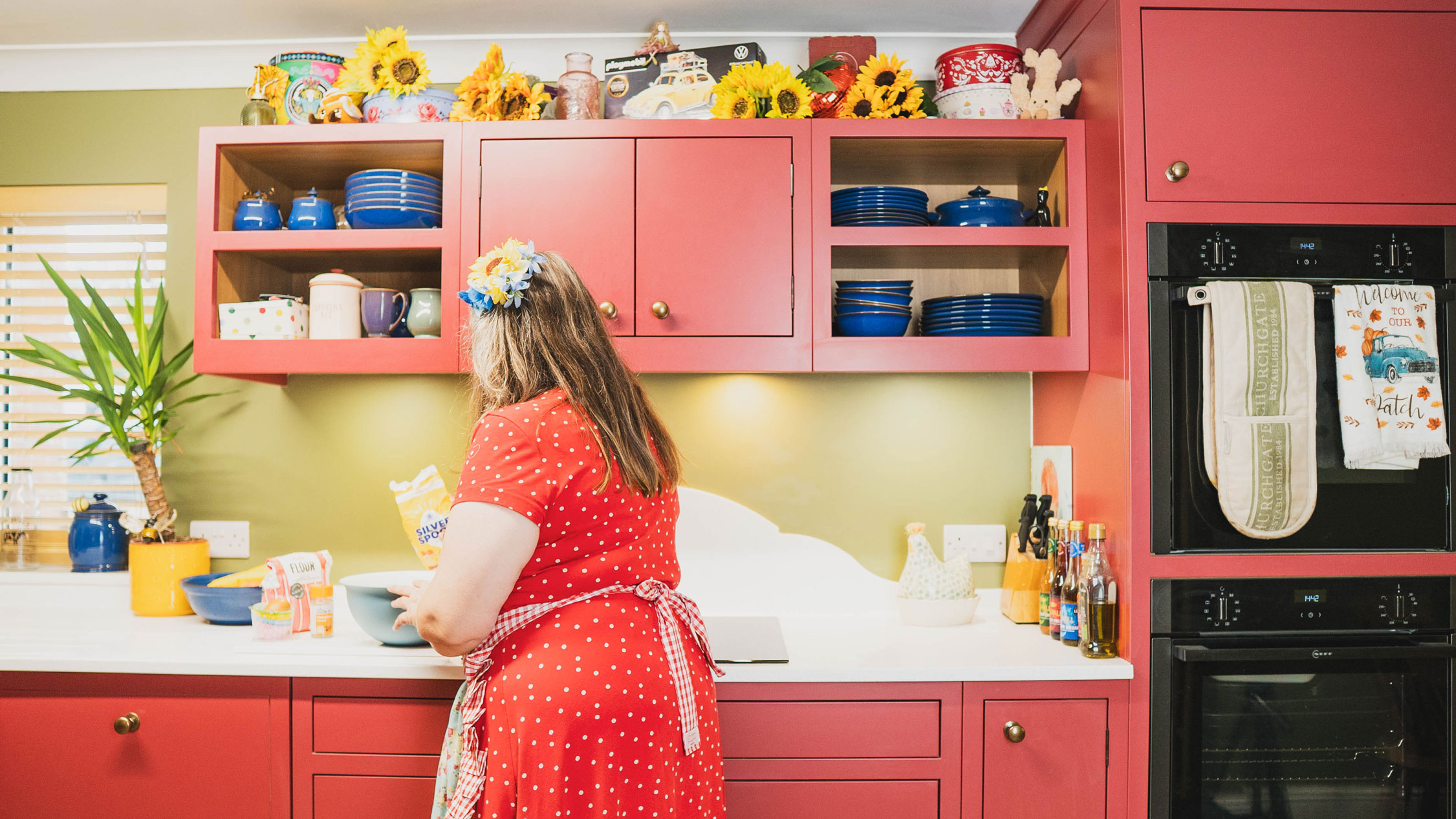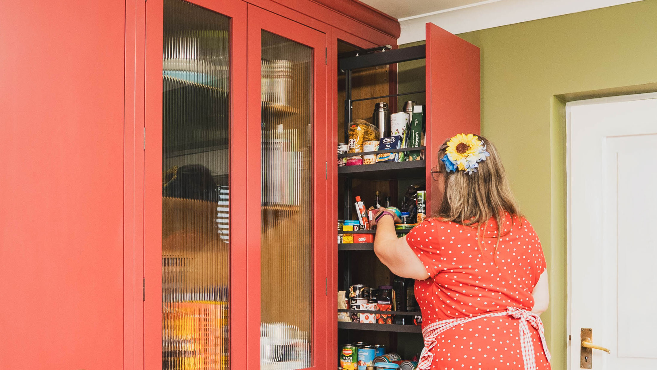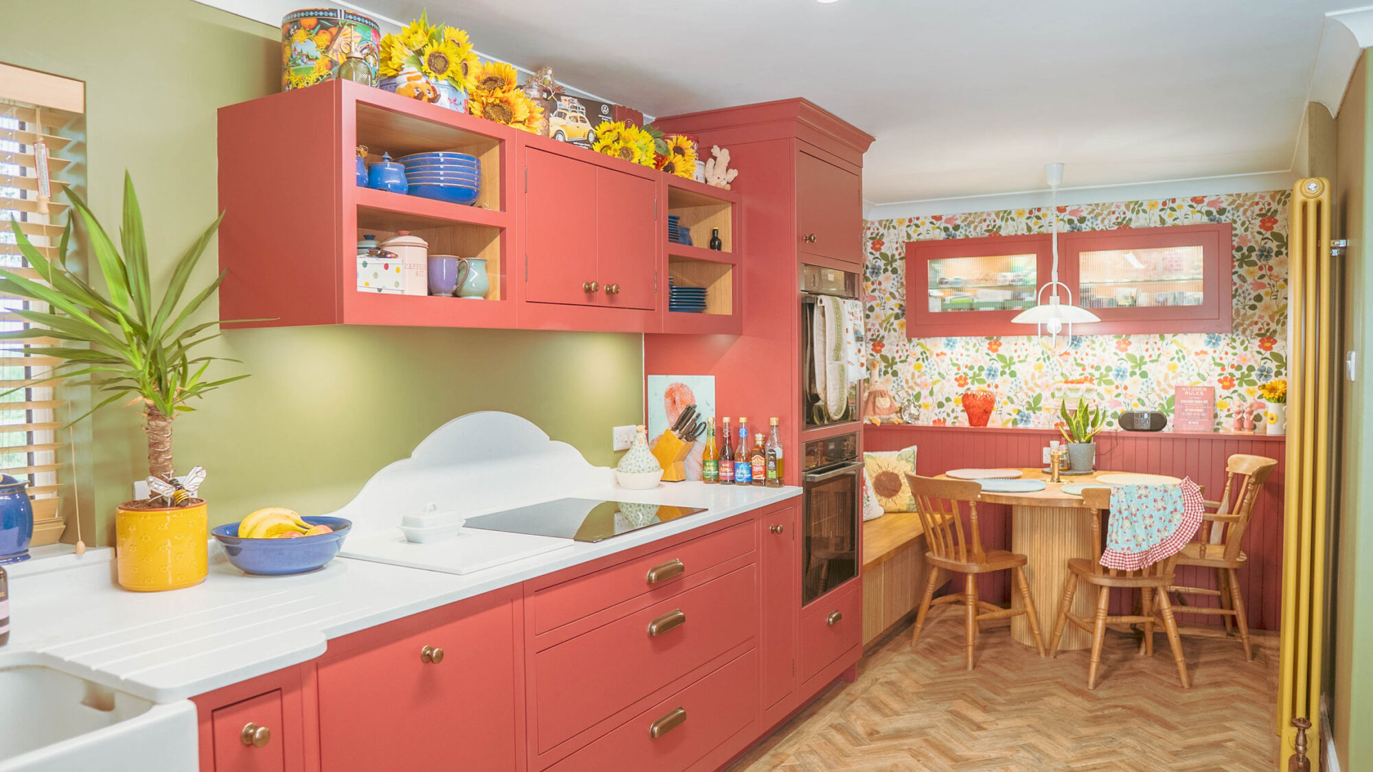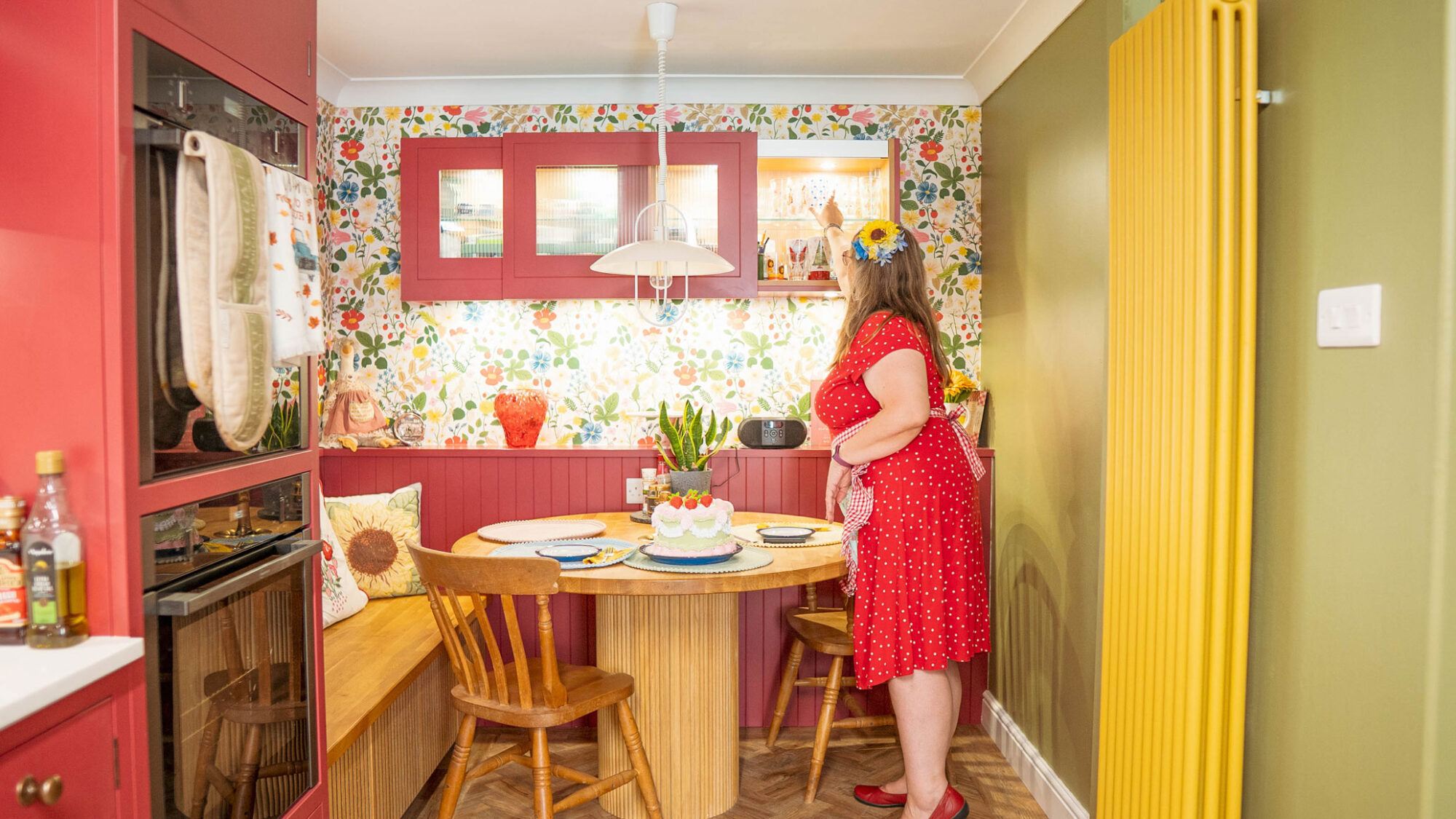 Painterly floral wallpaper unfurls across the walls, softening the lines with nostalgic charm. Nearby, a 1950s-style sliding wall unit with reeded glass glows with vintage elegance, offering both texture and transparency. Even the splashback, with its scalloped silhouette, adds a playful note — a quiet flourish that echoes the curves of the round wooden table, which sits at the heart of the room like an open invitation: to gather, to celebrate, to linger. More than a place to cook, this is a living canvas of memory and meaning, where timeless design meets personal flair and heartfelt connection.