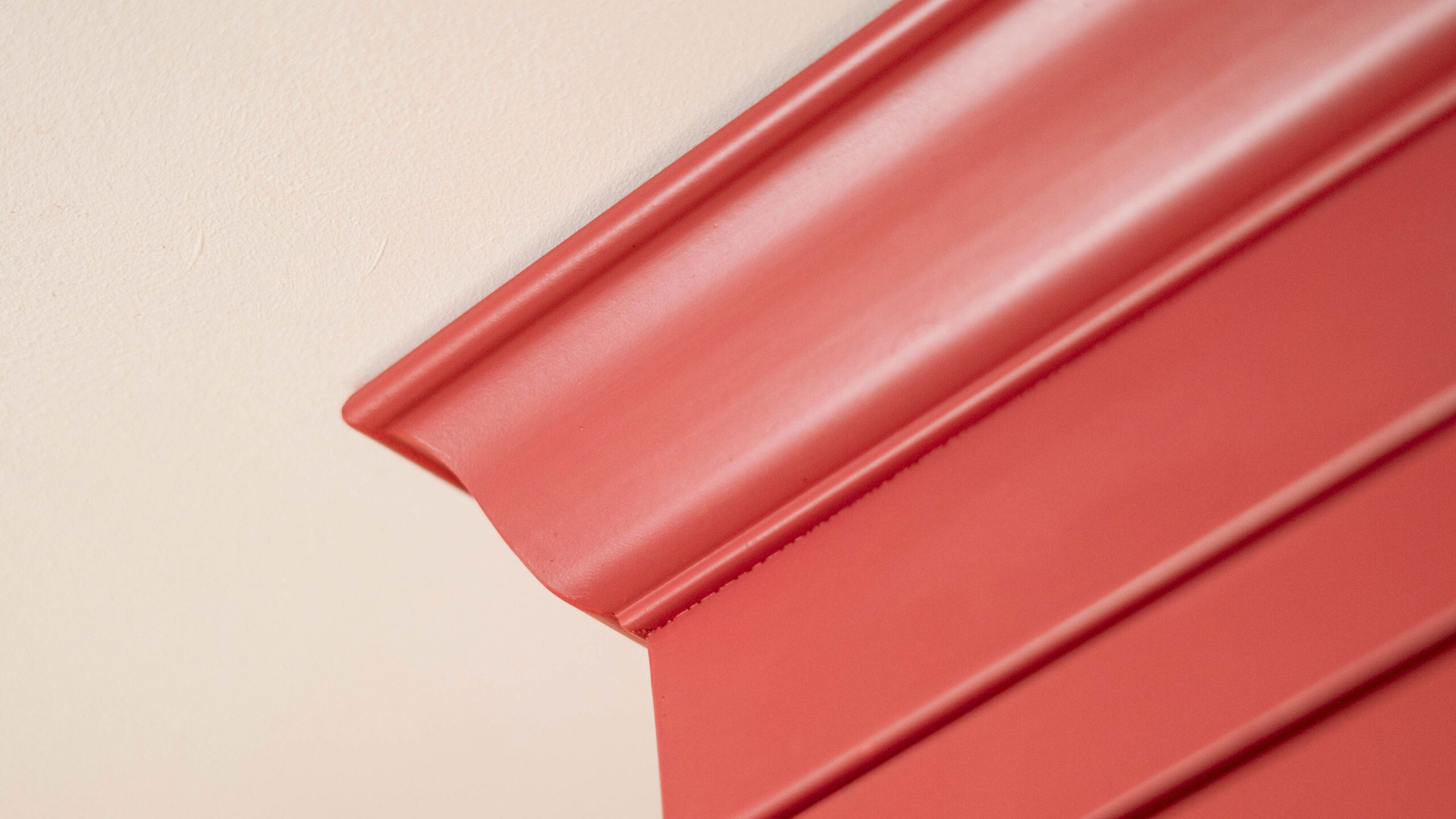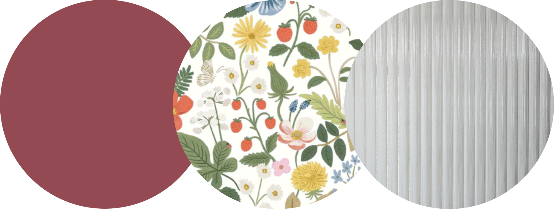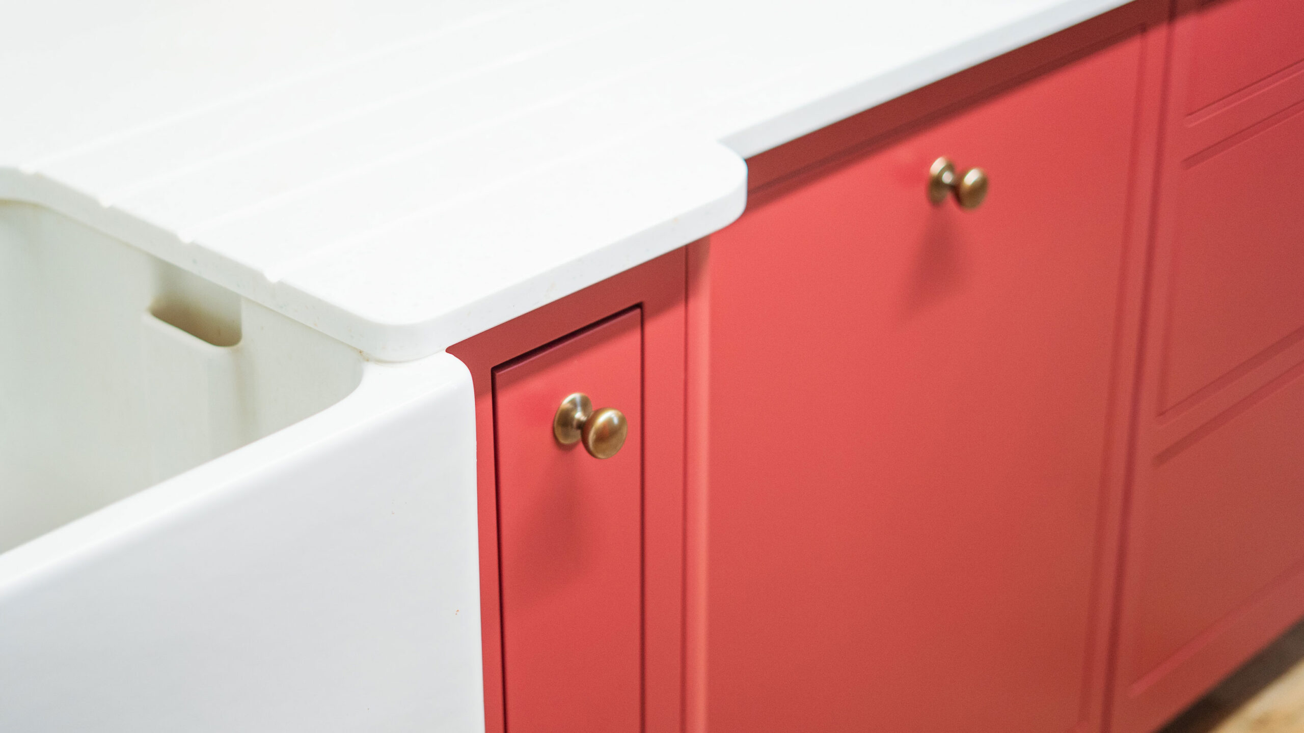 Radicchio-red cabinetry with bronze handles grounds the room in warmth and character, while crisp white surfaces and herringbone wood flooring strike a graceful balance of contrast and calm.