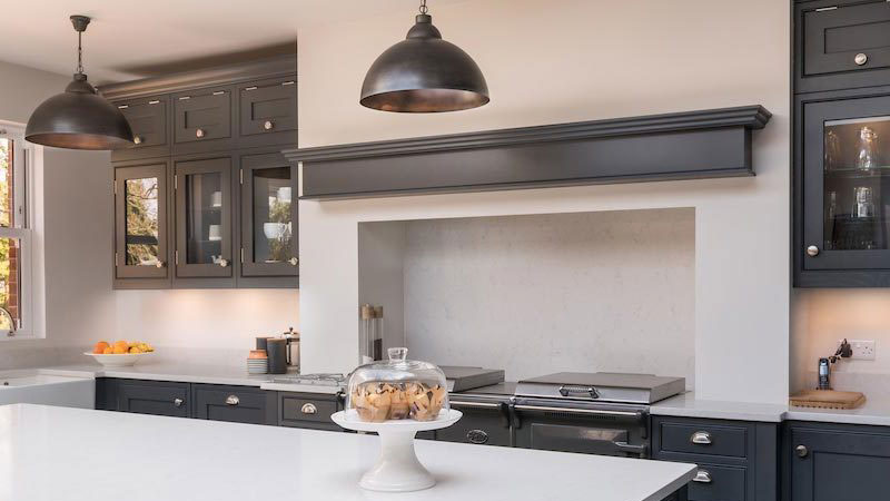 The stunning range cooker and bespoke mantle make a magnificent statement and gives a wonderful sense of symmetry to the space. To turn it into a grand feature we designed and built a false fireplace to house the range.