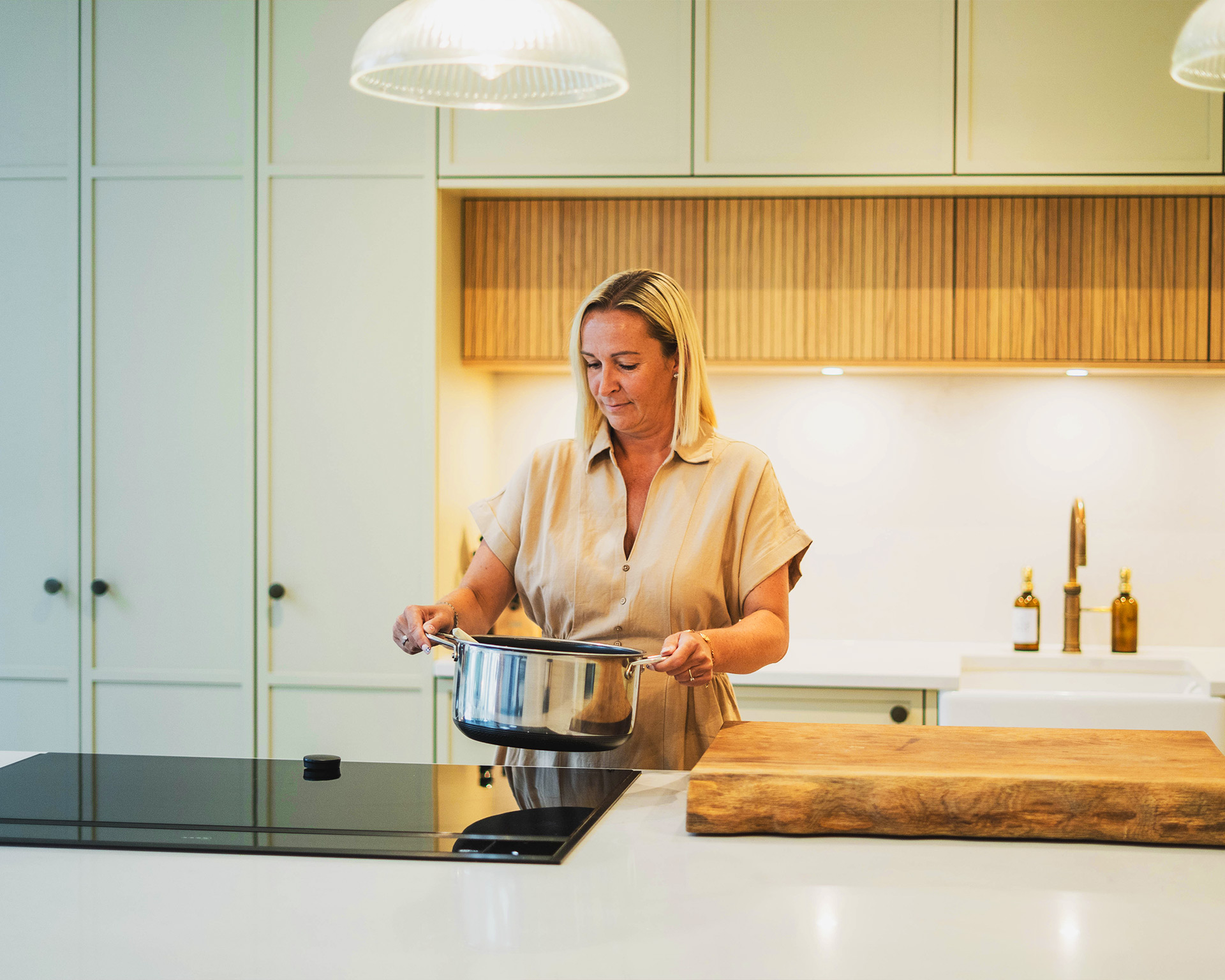 With their earthy, natural undertones, dusky pinks, warm greiges and sage greens are perfect for bringing a calm and cosy atmosphere to your space. A contrasting white wall colour will really make your cabinetry pop, creating a radiant modern setting. However, for something altogether warmer and more harmonious, consider toning your door finish in with your wall colour.