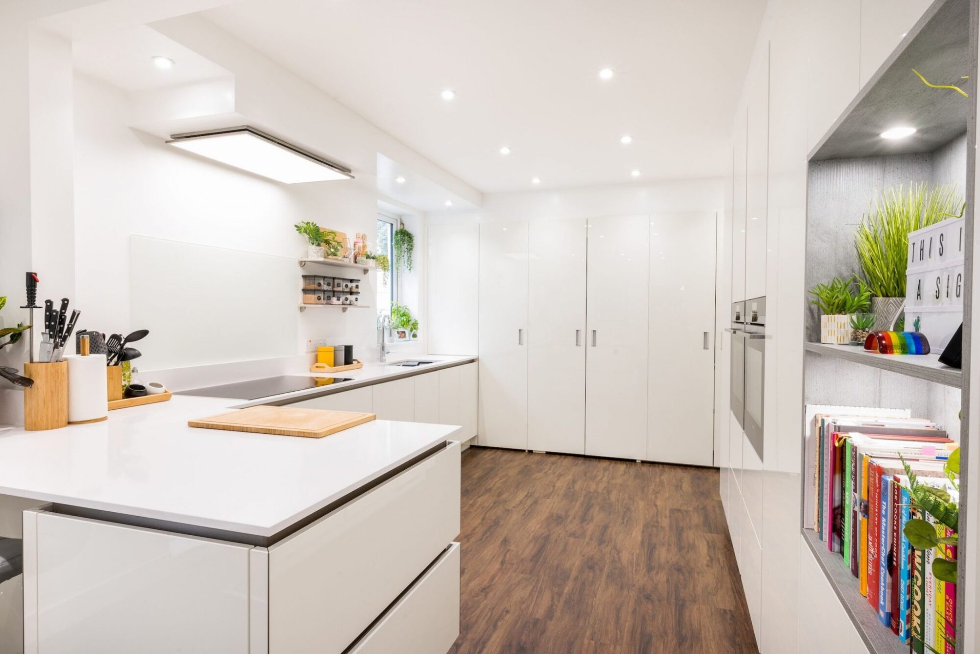 The first image that springs to mind when we mention modern handleless kitchens is the all-white kitchen. Going all-white and streamlining your tall units is a great way to make your room feel spacious without compromising storage. Open shelving, houseplants and warm wood textures will prevent your scheme from looking too stark.